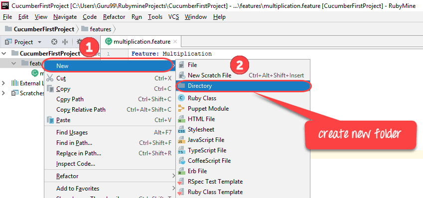 步骤 4) 在“yourfolder/features/”中创建并保存文件,文件名为“yourfilename.feature”