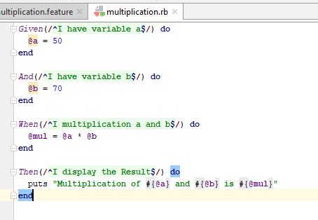 Feature: Multiplication I multiply two numbers Scenario: multiply a and b Given I have variable a And I have variable b When I multiplication a and b Then I display the Result
