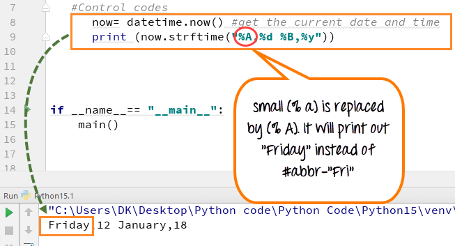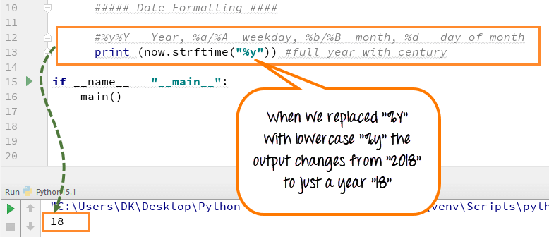 步骤2) 现在,如果您将(“%Y”)替换为小写,即(“%y”)并执行代码,输出将只显示(18),而不是(2018)。年份的世纪将不会显示,如下图所示