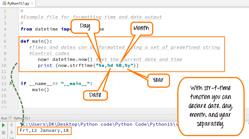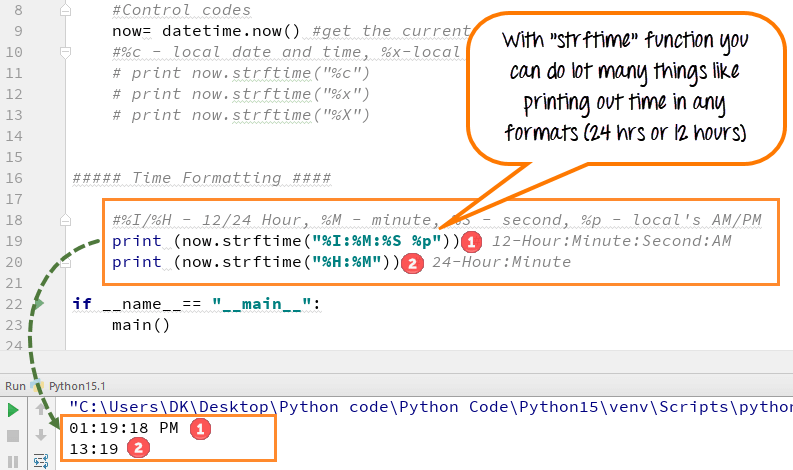 步骤5) “strftime函数”允许您以任何格式(24小时制或12小时制)调用时间。