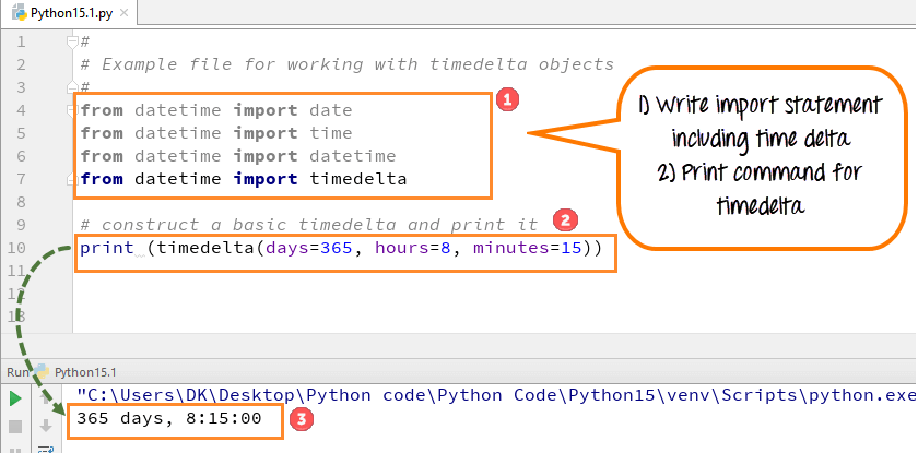 - 现在编写代码以打印timedelta对象,如屏幕截图所示
