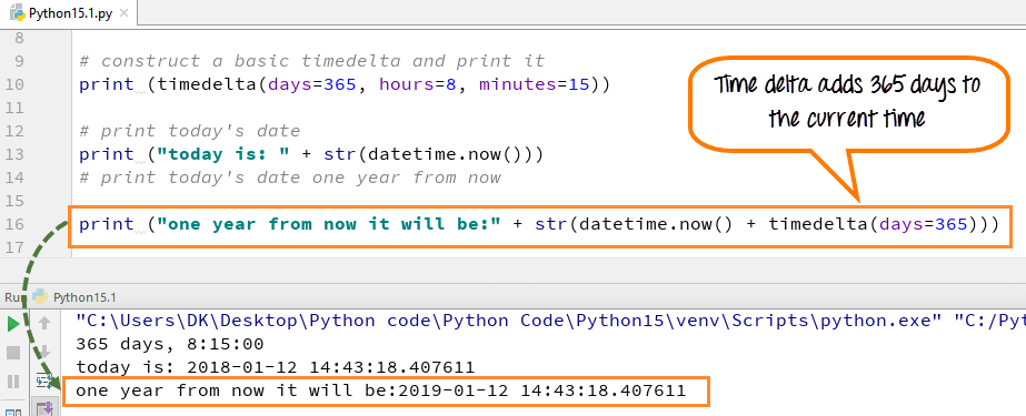 print "one year from now it will be:" + str(datetime.now() + timedelta(days=365))