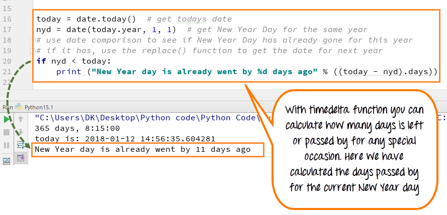 - 我们知道新年总是在1月1日,但年份可能不同。使用nyd= date(today.year,1,1),我们将新年存储在变量nyd中