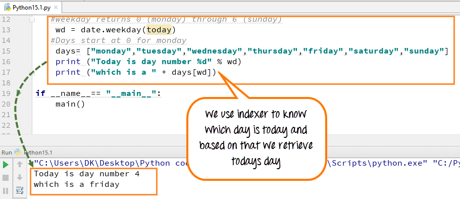 - 使用该索引值来确定今天是星期几。在我们的例子中,它是#2,代表星期三,所以输出将显示“今天是星期三”。