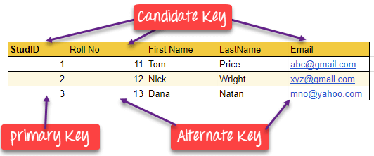 - 备用键 – 是表中唯一标识每行的列或列组。
