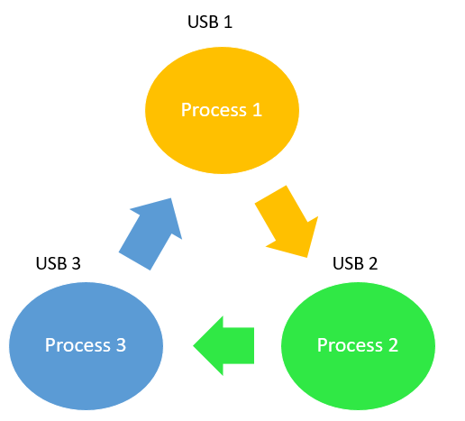 例如,一台计算机有三个 USB 驱动器和三个进程。三个进程中的每一个都可以拥有一个 USB 驱动器。因此,当每个进程请求另一个驱动器时,三个进程将处于死锁状态,因为每个进程都将等待释放当前正在使用的 USB 驱动器。这将导致一个循环链。