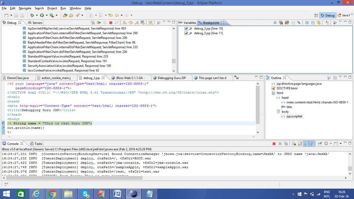 代码第 11 行: 我们使用 println 语句打印“This is debugging Guru JSP”来调试已执行的代码行。