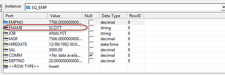 对于ename为“SCOTT”的记录,使用调试器我们将检查Informatica中获取的“sal”(薪水)列的值。