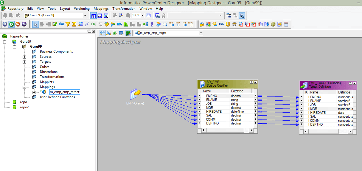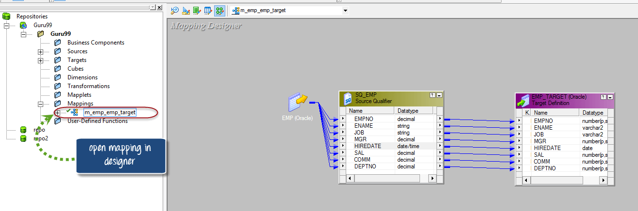 步骤 1)打开Informatica Designer,并通过双击来打开映射“m_emp_emp_target”。它将在Mapping Designer中显示源限定符和目标定义表,其中包含映射。