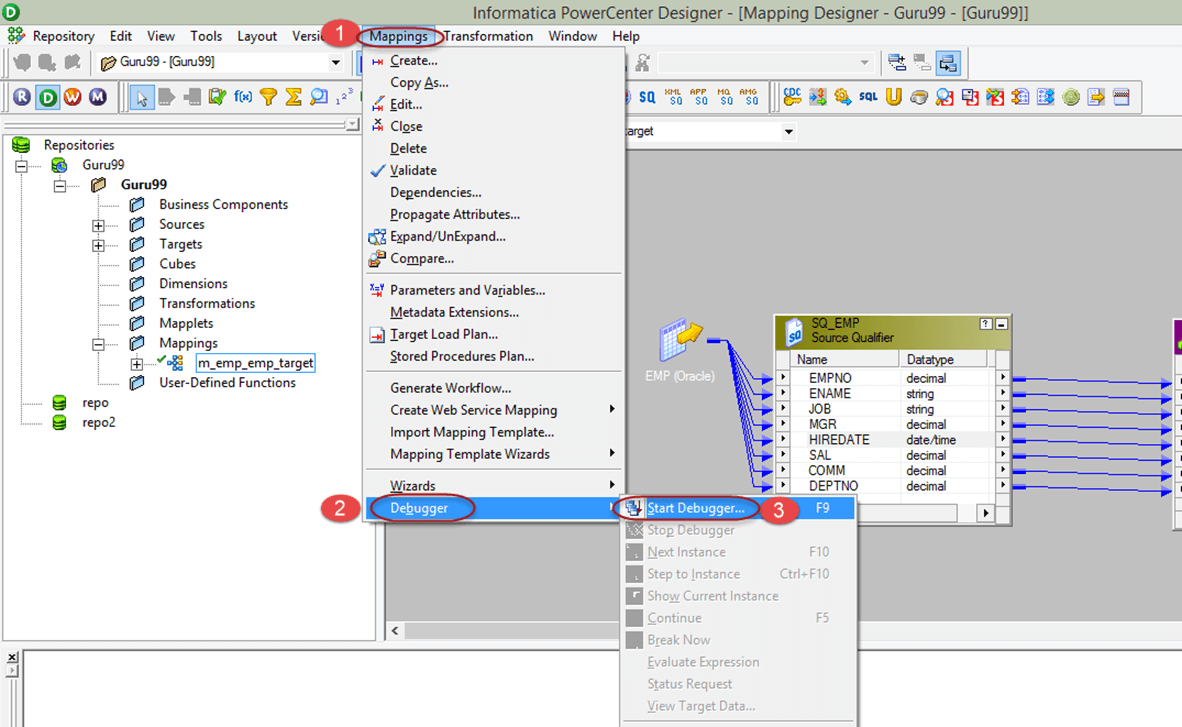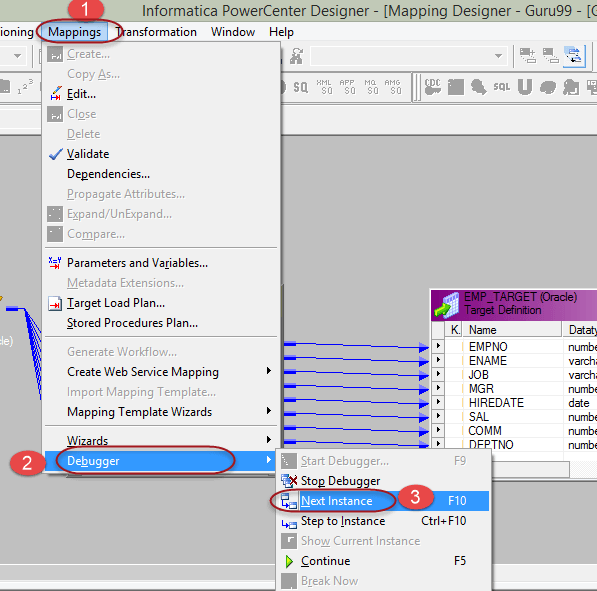 在练习中,我们将调试我们之前创建的现有映射“m_emp_emp_target”。在我们的源数据中,我们将检查 employee_name = ‘SCOTT’ 的特定记录。对于Scott,我们将验证值是否在Informatica中正确获取,以及记录是否已正确推送到目标。