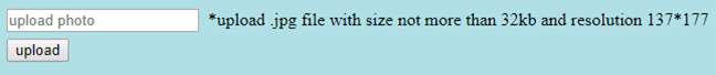 - 上传一张格式为“.jpg”,大小大于32kb,分辨率为137*177的照片,然后点击上传。预期结果是应该显示错误消息“大小不匹配”。