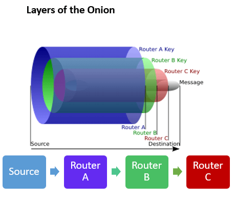 在这里,发件人保持匿名。只知道紧邻的上一跳和下一跳节点的位置。这些加密数据通过一系列称为洋葱路由器的网络节点传输。因此,当最后一层解密后,消息就会到达目的地。