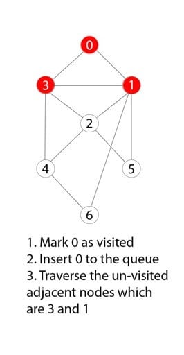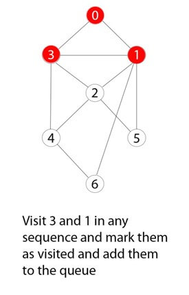 0 的剩余邻近且未访问的节点被访问、标记并插入队列。