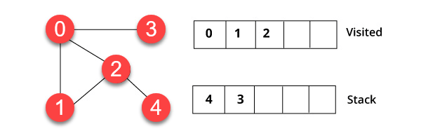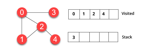 顶点 2 有一个未访问的邻近顶点 4。因此,我们将其添加到栈中并访问它。