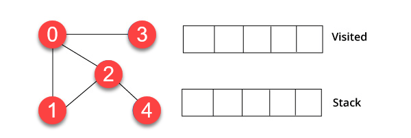 我们从顶点 0 开始。算法开始时,将其放入访问列表,同时将其所有邻近顶点放入一个称为栈的数据结构中。