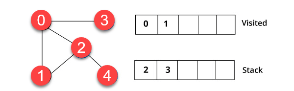 您将访问栈顶的元素,例如 1,然后转到其邻近节点。这是因为 0 已经被访问过了。因此,我们访问顶点 2。