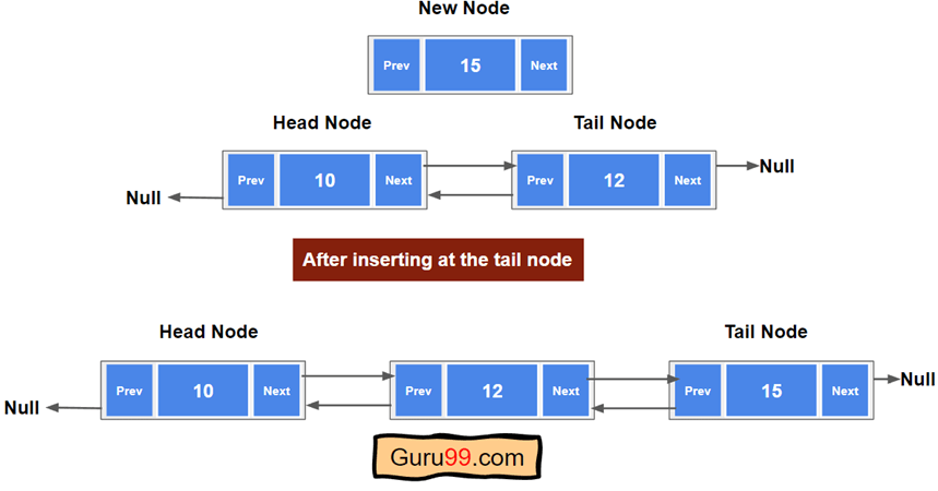 “末尾插入”意味着我们将创建一个链表节点并将其放置在末尾。