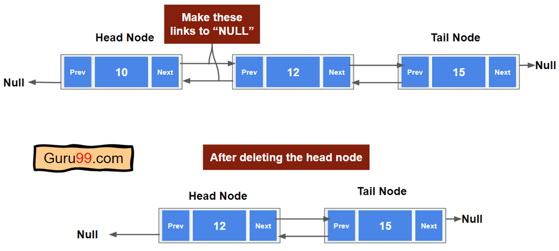 双向链表中的头节点没有前驱节点。因此,如果要删除头节点,则下一个指针将成为新的头节点。删除节点时,我们还需要释放节点占用的内存。