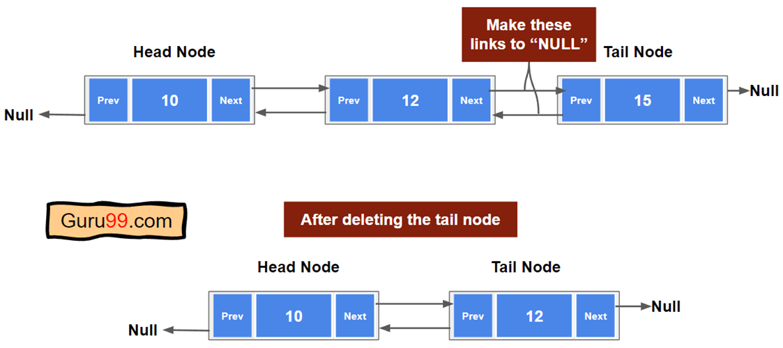此操作与删除头节点类似。这里,我们需要删除尾节点而不是头节点。要将节点识别为尾节点,我们应检查下一个指针或下一个节点是否为 null。删除尾节点后,我们需要释放内存。
