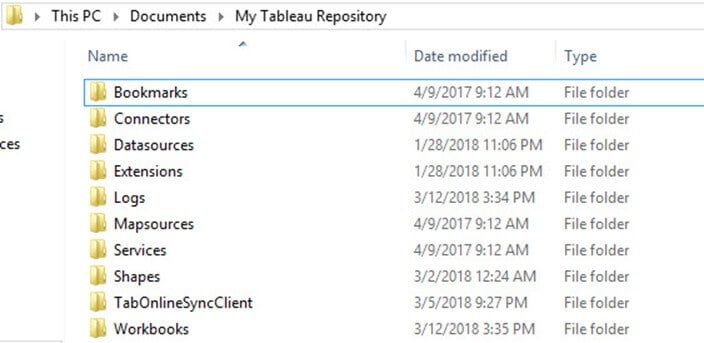 Tableau 存储库用于存储与 Tableau Desktop 相关的所有文件。它包括各种文件夹,如书签、连接器、数据源、扩展程序、日志、地图源、服务、形状、TabOnlineSyncClient 和工作簿。我的 Tableau 存储库通常位于文件路径 C:\Users\User\Documents\My Tableau Repository。