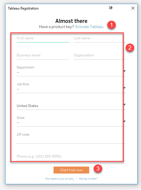 - 单击“激活 Tableau”并输入您的许可证详细信息。