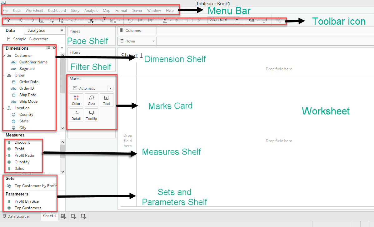 Tableau Desktop 工作区包含如图所示的各种元素。