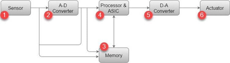 - 嵌入式系统的架构包括:传感器、A-D 转换器、内存、处理器和 ASIC、D-A 转换器和执行器。