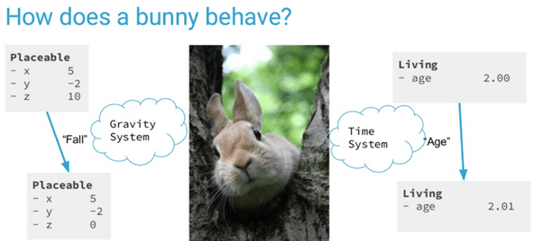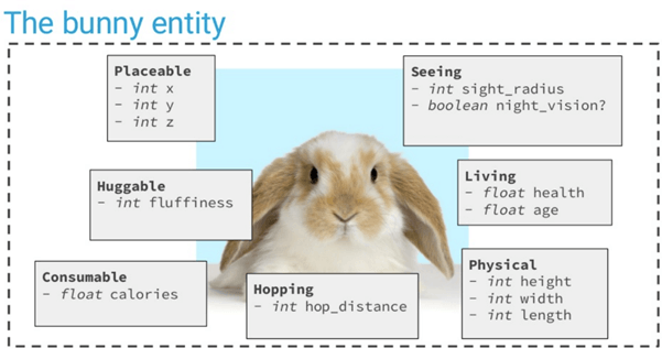 您可以看到上面给出的图像。它是兔子实体之一——只不过是组件的容器。您可以将实体定义为任何组件子集的聚合,例如胡萝卜。