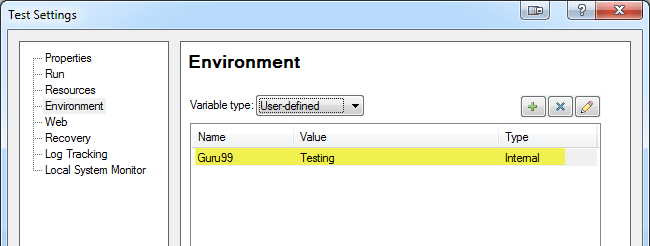 用户定义 – 内部变量:这些变量由用户在执行测试之前定义,并且仅适用于特定测试