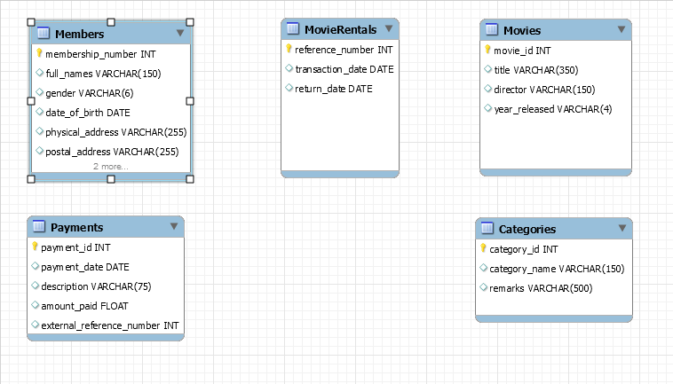 - 电影租赁 – 此实体将存储有关租借给会员的电影的信息。