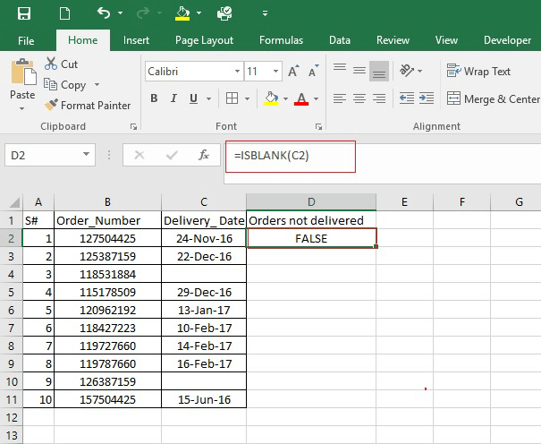 要查找未交付的订单,需要将公式应用于每个单元格。对于订单“118531884、126387159”,未给出交货日期,并且该单元格为空。因此,ISBLANK 函数返回 true。交货日期为 true 的订单就是尚未交付的订单。