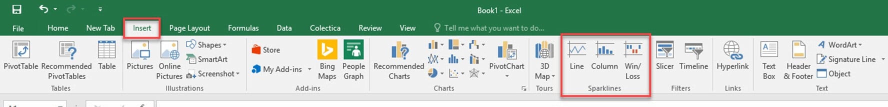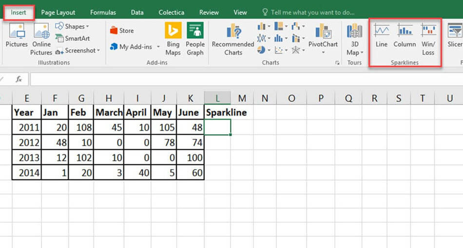 从“插入”菜单中,选择您想要的迷你图类型。它提供了三种 Excel 迷你图类型。