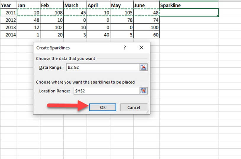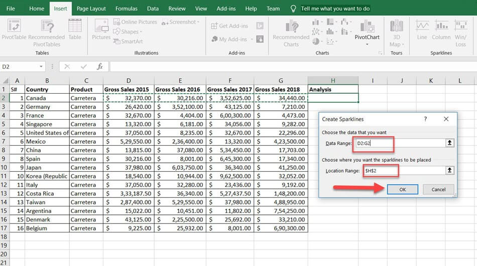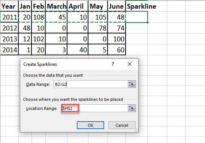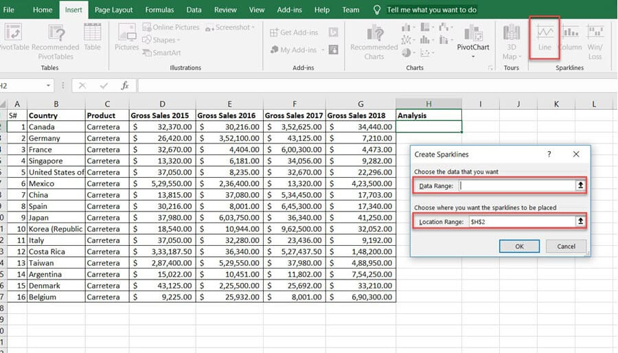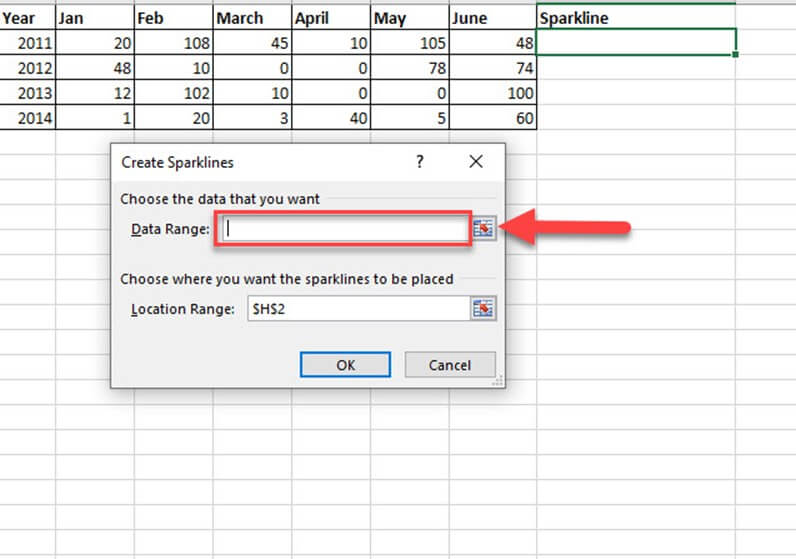 步骤 3) 选择您要插入的迷你图类型之一。它会要求您输入单元格范围。从可用的迷你图类型中选择线条类型。