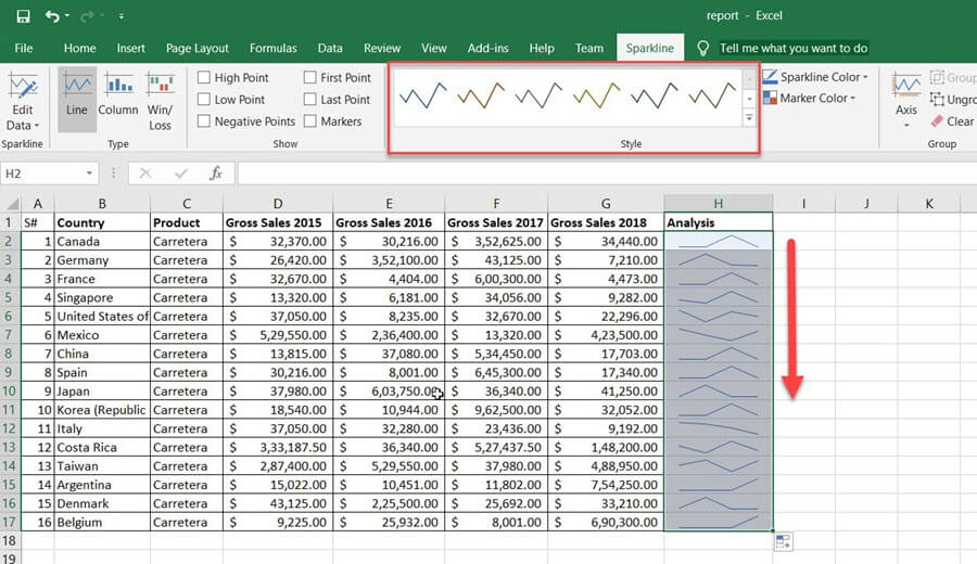 步骤 5) 迷你图将插入 H3 单元格。您可以通过向下拖动将迷你图应用于整个数据。