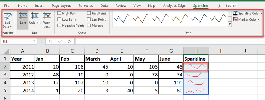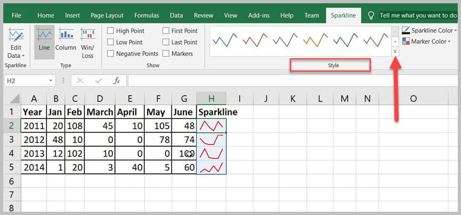 可以根据您的需要自定义迷你图的不同属性。样式、颜色、粗细、类型、轴是其中的一部分。