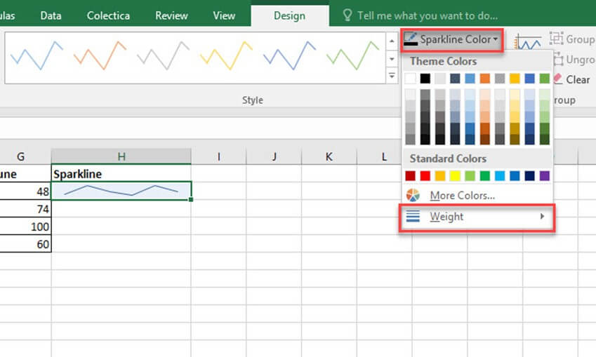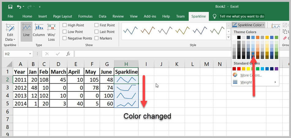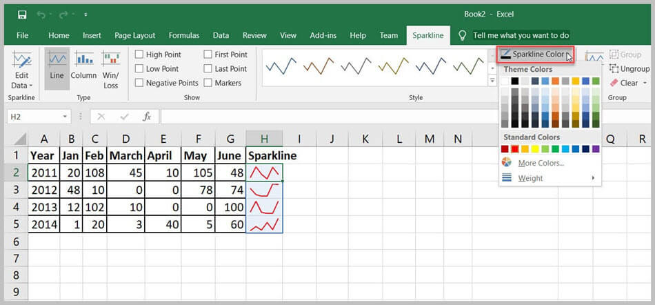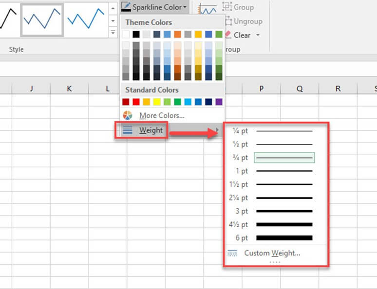 可以使用“迷你图颜色”选项更改迷你图的颜色和粗细。它提供了多种颜色。