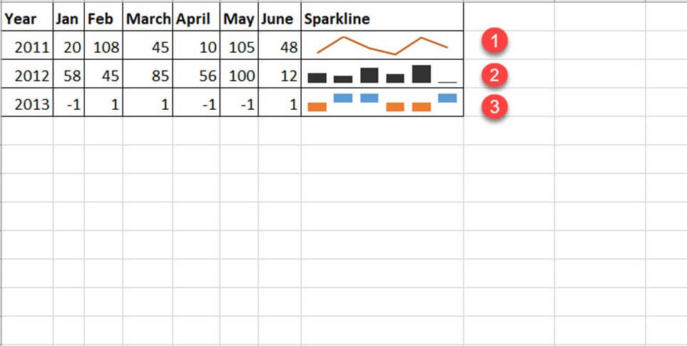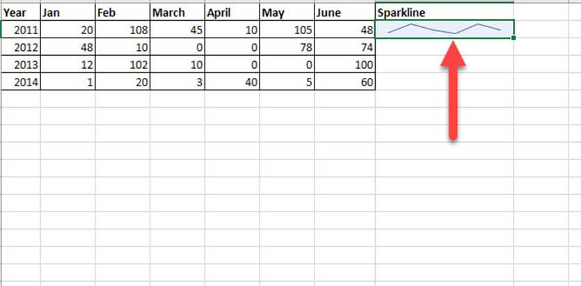 选择“六月”旁边的下一列,然后从插入菜单中插入迷你图。从三种迷你图类型中选择一种。