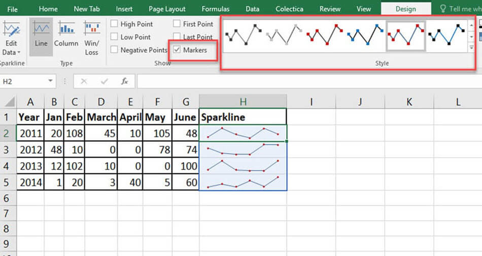 要格式化迷你图,请先单击已创建的迷你图。菜单栏上会出现一个名为“设计”的新选项卡,其中包含迷你图工具,可帮助您更改其颜色和样式。逐一查看可用选项。
