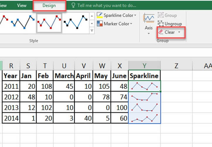 步骤 3) 单击“清除”选项,这将从单元格中删除选定的迷你图。