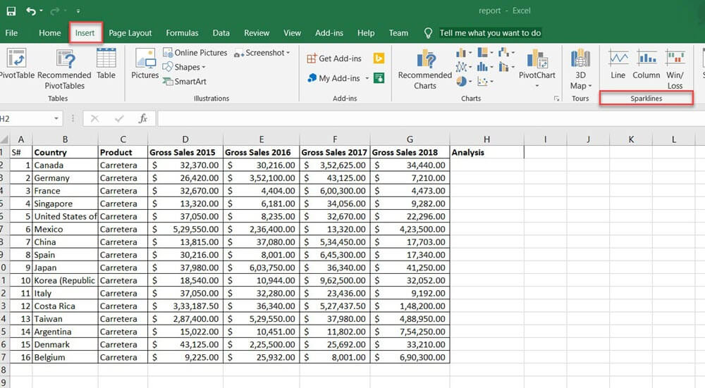 步骤 1)在 2018 年总销售额旁边创建一个柱状图分析。在下一步中,您将插入迷你图。