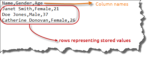 CSV 是“逗号分隔值”的缩写。它用于存储表格数据,其中列名和行值用逗号分隔。下图说明了这一点。