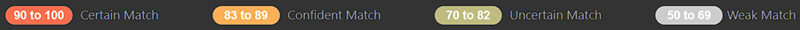 匹配置信度级别是找到图像输入的正确结果的一个好方法。FaceCheck ID 有四个匹配等级,**90 到 100** 为最确定匹配(Certain Match),**83 到 89** 为自信匹配(Confident match),**70 到 82** 为不确定匹配(Uncertain Match),**50 到 69** 为**弱匹配**(Weak Match)。