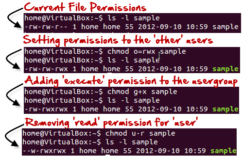 在绝对模式下,您可以更改所有3个所有者的权限。在符号模式下,您可以修改特定所有者的权限。它利用数学符号来修改Unix文件权限。