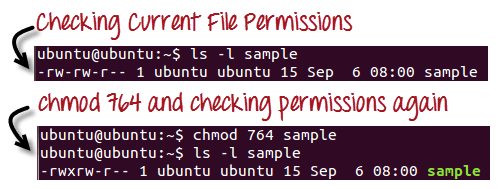 在上面提供的终端窗口中,我们将文件“sample”的权限更改为“764”。