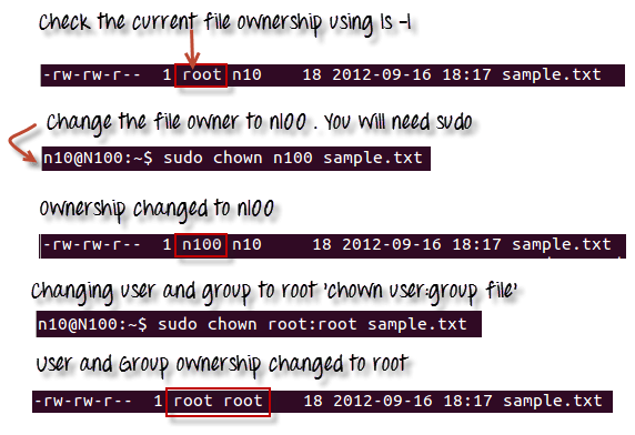 - ‘chown’命令可以更改文件/目录的所有权。使用以下命令:chown user file 或 chown user:group file。