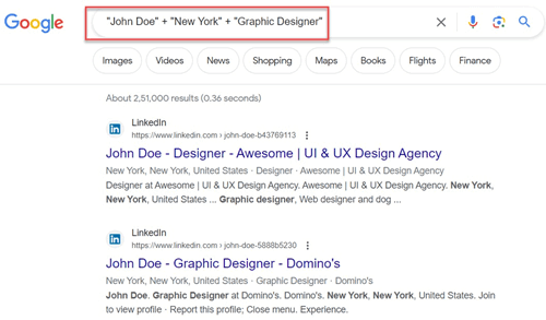 步骤 3) 如果此人的姓名很常见,请添加更多信息,例如他们的位置、工作地点或任何其他已知详细信息。例如,“John Doe”+“纽约”+“平面设计师”。