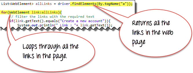 findElements() 方法返回一个带有标签 a 的 Web 元素列表。使用 for-each 循环访问每个元素。