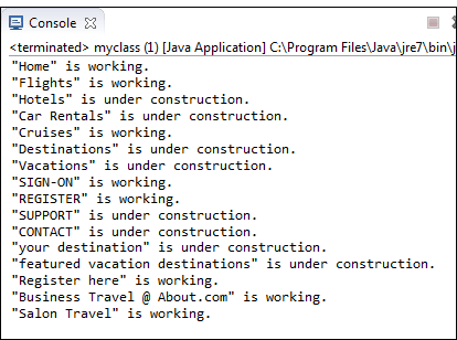 下面的 WebDriver 代码检查 Mercury Tours 主页上的每个链接,以确定哪些链接是有效的,哪些仍在建设中。
