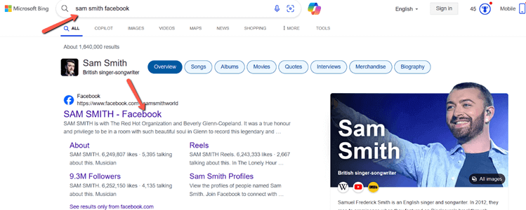 Bing的问题在于,有时即使个人主页是公开的,它也无法链接到Facebook账号。这可能令人非常沮丧,因为链接会导向各种网站,但没有一个指向社交媒体。在这种情况下,请使用Bing找到的信息,如全名、职业等,进行手动搜索以查找账号。