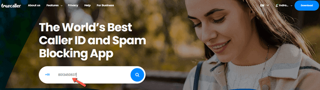 步骤1)打开URLwww.truecaller.com。在搜索栏中,输入您要追踪的未知电话号码。